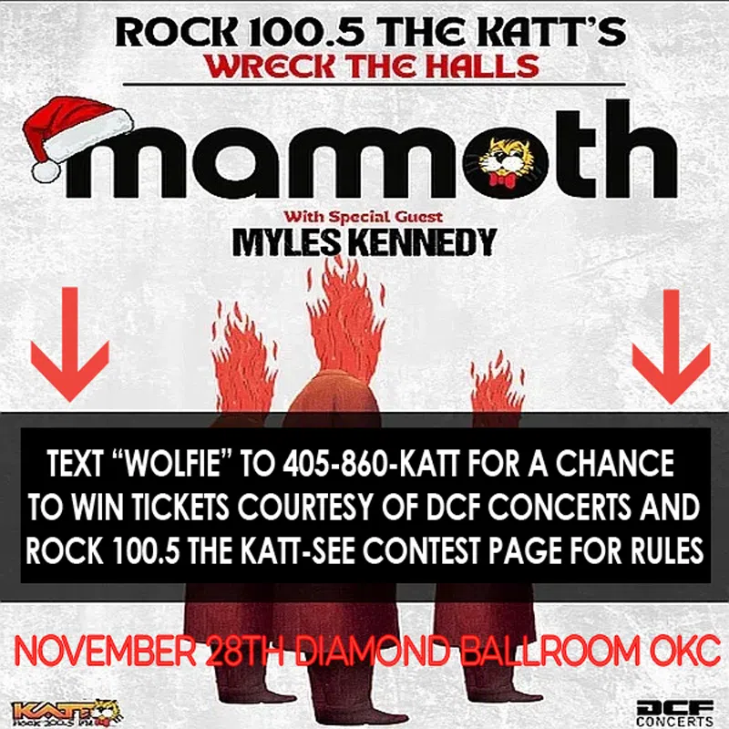Be a part of our wrecking crew for the holiday kickoff the day after Thanksgiving. Text “WOLFIE” to 405-860-KATT for a chance to win free tickets to see Mammoth, Myles Kennedy and Return to Dust at the Diamond Ballroom on November 28th, 2025. It’s the KATT’s annual Christmas show-Wreck the Halls 2025!! Tickets are on sale now at DiamondBallroom.COM and courtesy of DCF Concerts and Rock 100.5 the KATT!